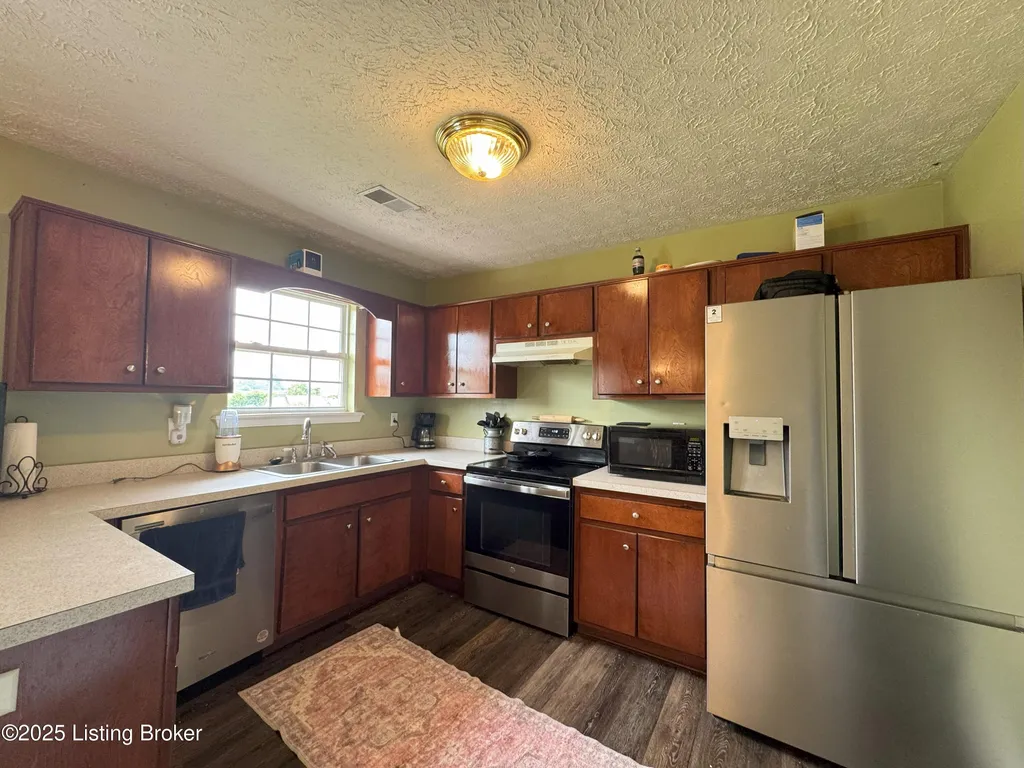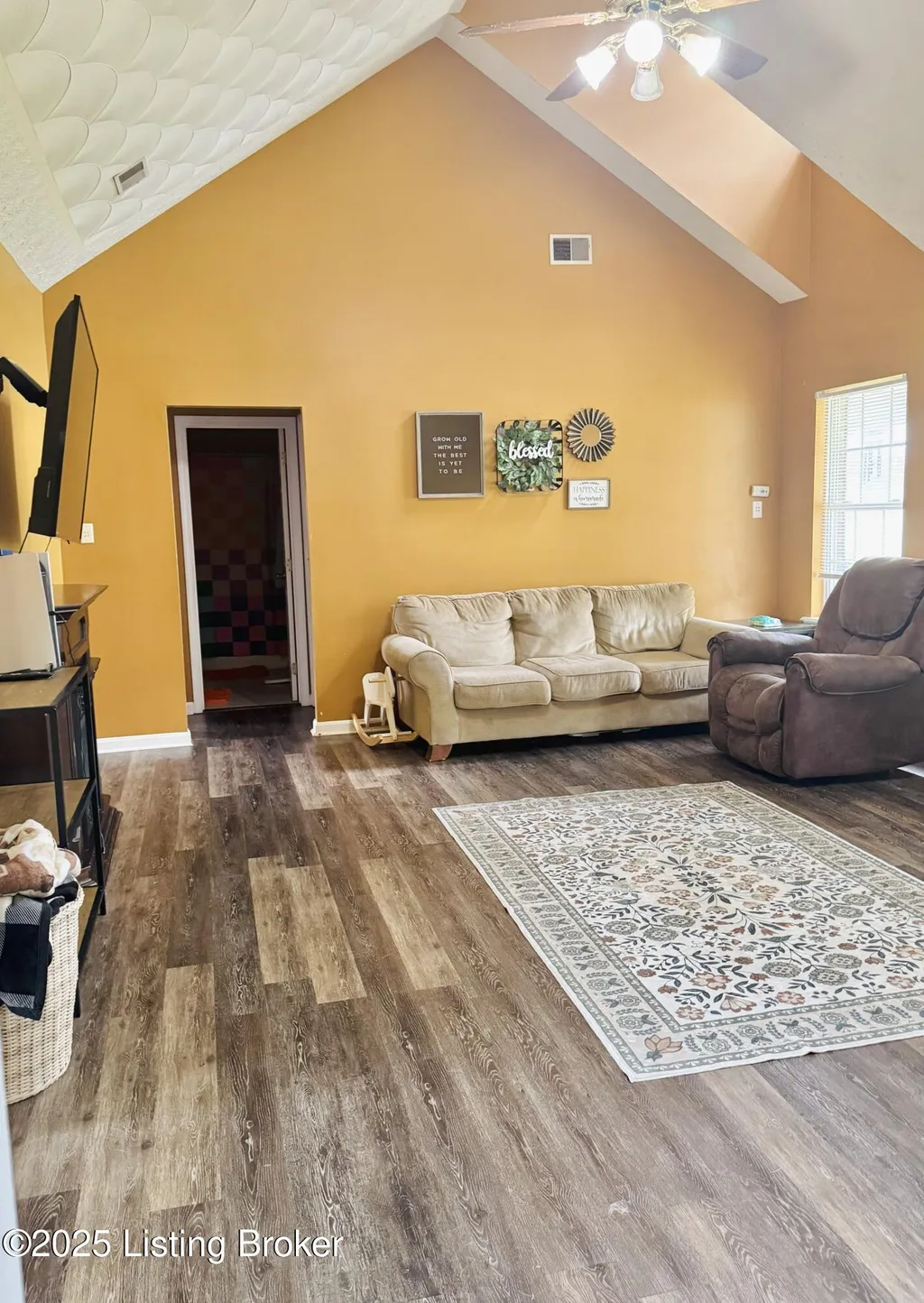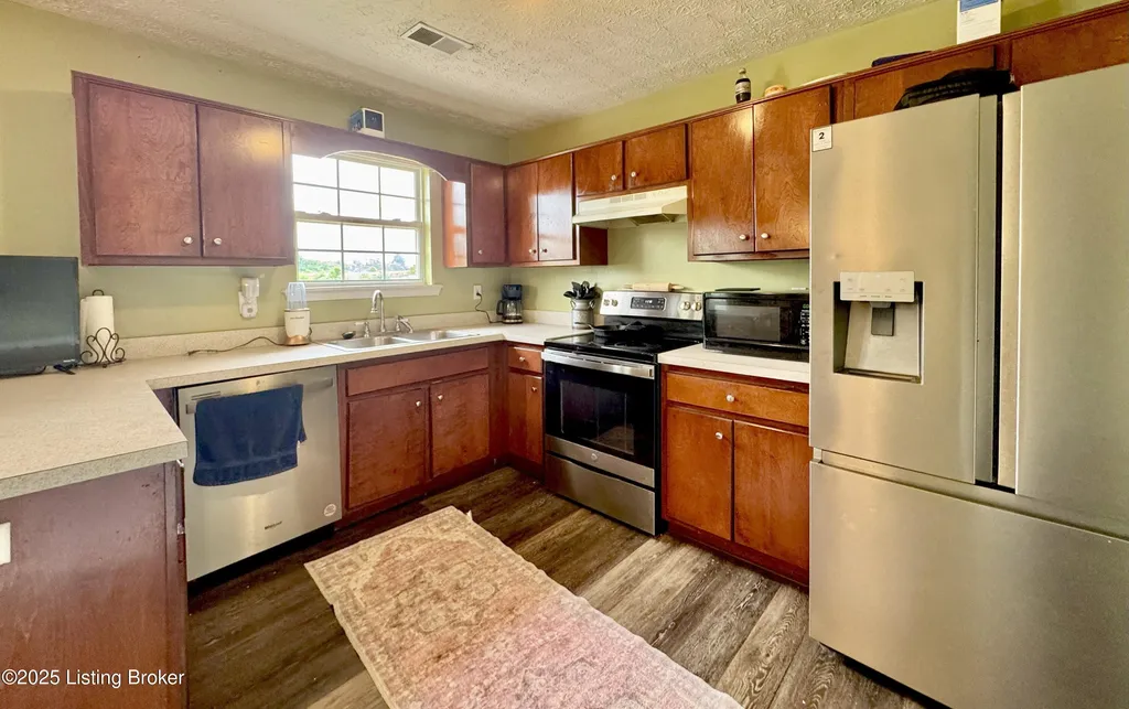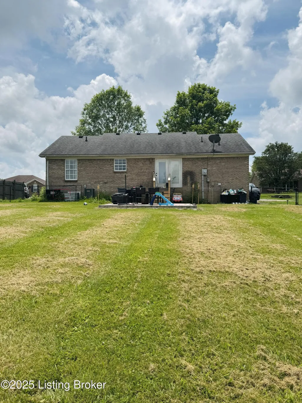 Charming 3-bedroom, 2-bath ranch located in a quiet cul-de-sac just minutes from historic downtown Bardstown! This 1,363 sq ft home offers a spacious family room with vaulted ceilings and an abundance of natural light. The spacious kitchen features stainless steel appliances and opens to a dining area with access to a large, fully fenced backyard and concrete patio. Also Offers a split bedroom layout and a convenient, dedicated laundry area. Enjoy the mature shade of your front yard from the large covered front porch. Located in an established, family-friendly neighborhood.