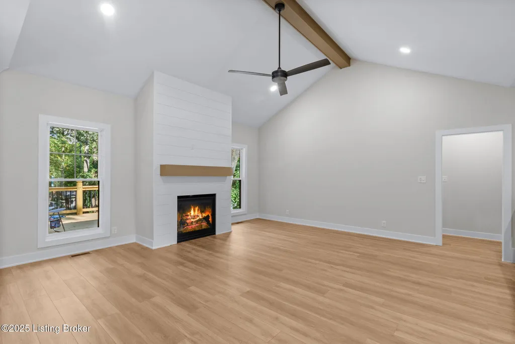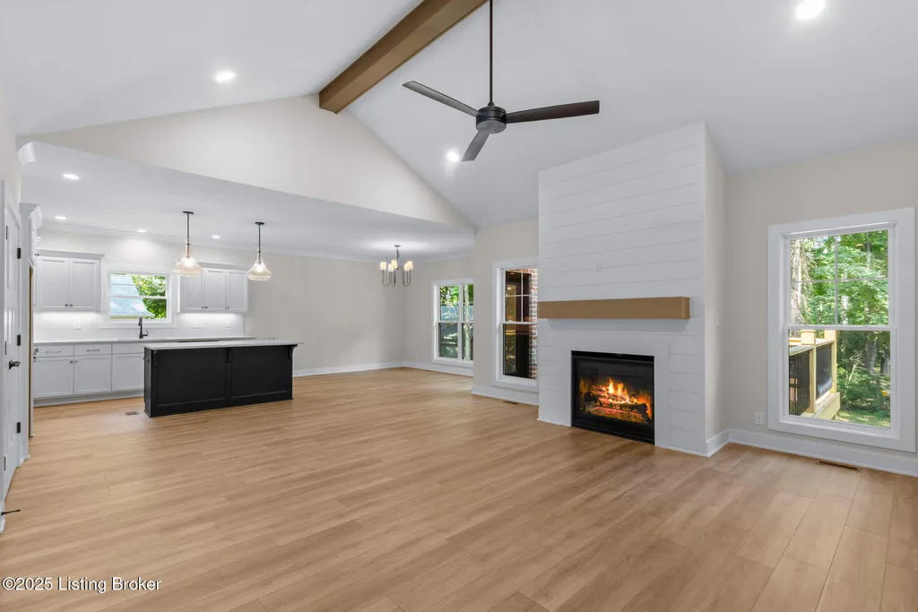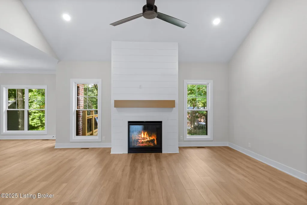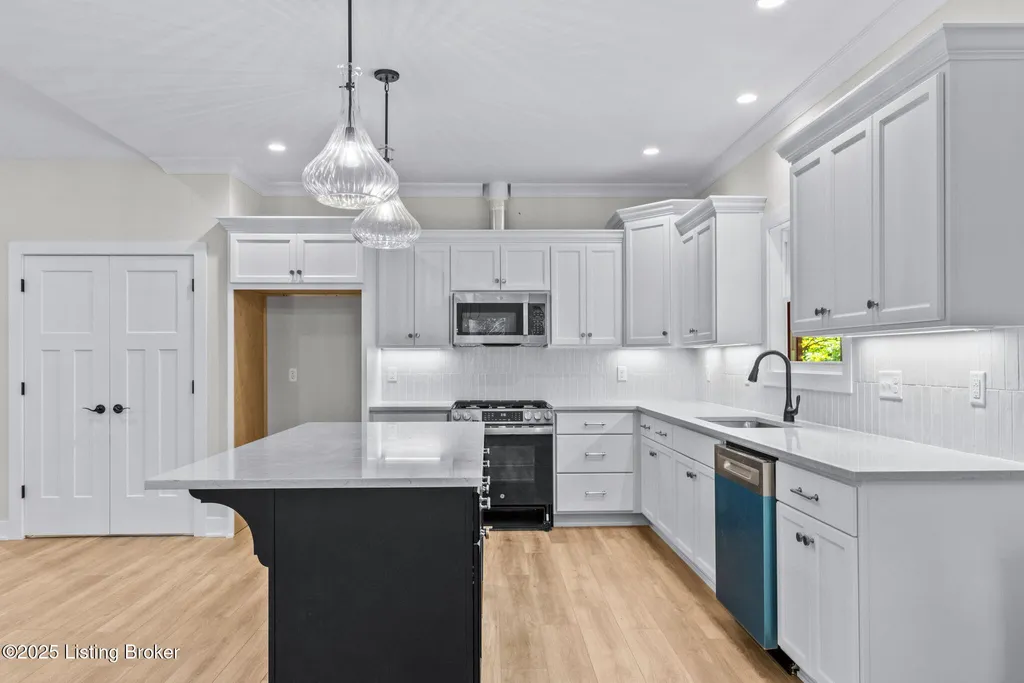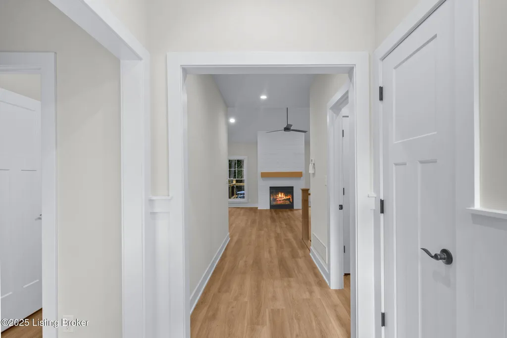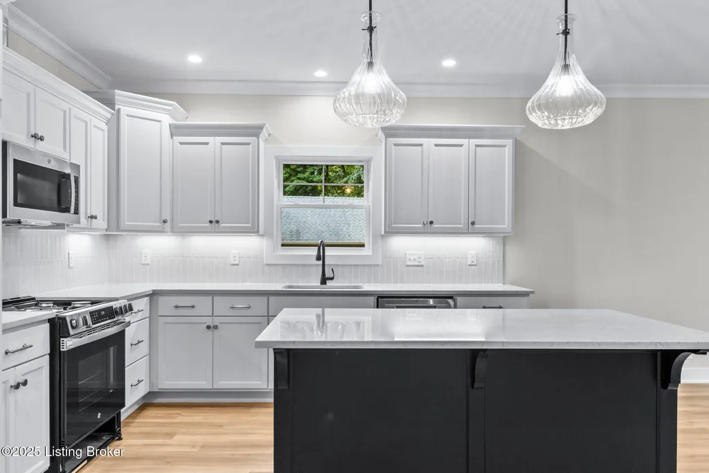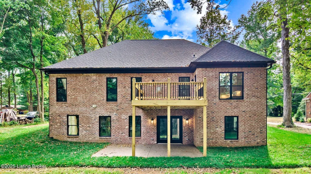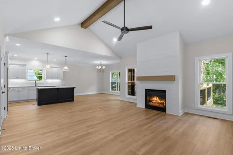 Tucked away in the heart of highly sought-after Pewee Valley, this brand-new construction offers an impressive blend of timeless craftsmanship and modern design. The all brick-and-stone walkout ranch sits on a private, wooded .76-acre lot, giving you the rare combination of space, privacy, and convenience. Step inside through custom double wood entry doors to find soaring ceilings, abundant natural light, and an open floor plan that's perfect for both everyday living and entertaining. The great room is the centerpiece of the home, featuring a vaulted ceiling, a striking shiplap-accented gas fireplace, and seamless flow into the gourmet kitchen. Here you'll find a massive island, quartz countertops, stainless steel appliances with a gas range, and elegant finishes throughout. The primary suite is a true retreat, highlighted by a custom wainscoting accent wall, spa-like bathroom with a large soaker tub, double vanity, oversized walk-in shower with custom tile, and French gold fixtures. A giant walk-in closet provides more than enough space to stay organized. Each of the five bedrooms is generously sized with walk-in closets, and all three full bathrooms are finished with high-end details. Downstairs, the fully finished walkout basement expands the living space with a large open area, media room potential, a full wet bar with beverage refrigerator, and two huge bedrooms with a full bath. There's also plenty of unfinished storage. Outdoors, you'll enjoy a spacious rear deck and a patio below, both overlooking the private backyard surrounded by mature trees. Additional highlights include high-end LVP flooring, upgraded lighting throughout, an oversized two-car garage, and a large laundry room. The location offers quick access to I-265 via Old Henry Road, and is just minutes from historic Pewee Valley, Middletown, dining, shopping, parks, and award-winning Oldham County schools. This home truly checks every box; space, luxury, and convenience, all wrapped up in one extraordinary property.
