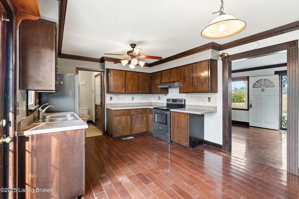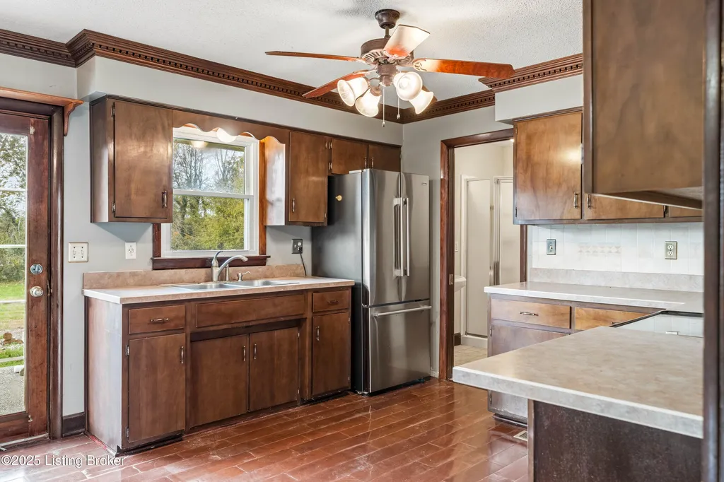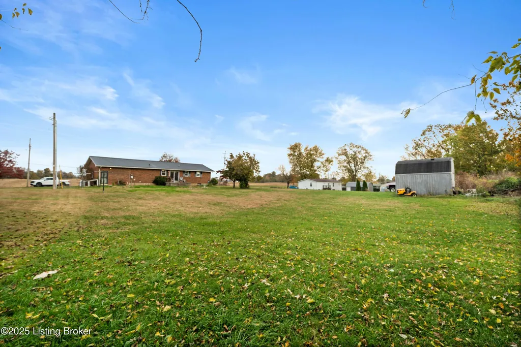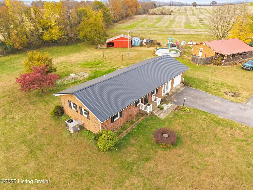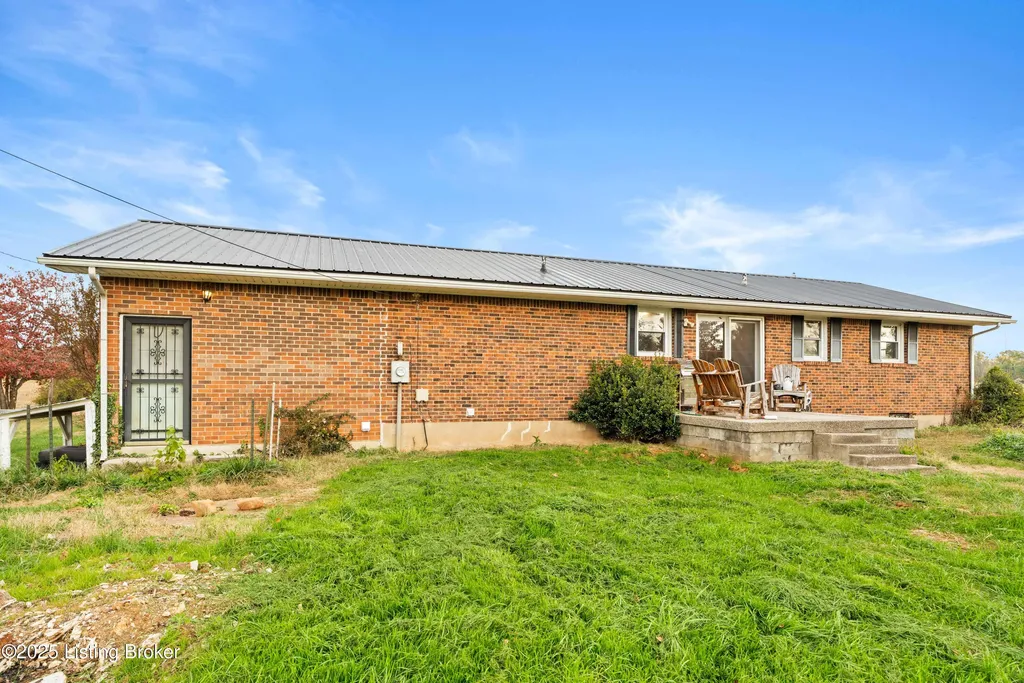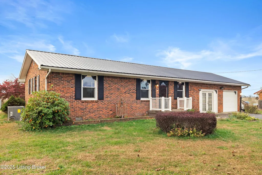 Irvington brick home Metal roof est. 3-4 yrs Replacement windows Engineered hardwood floors New HVAC 2025 Near schools and shopping Located along Highway 477 just outside of Irvington, this well-maintained 3-bedroom, 2-bath brick home blends comfort and updates throughout its 1,224 sq ft layout. The black metal roof and full replacement windows offer lasting value, while engineered hardwood flooring and crown molding add warmth and detail to every room. The kitchen features a stainless-steel stove and French-door refrigerator, with convenient flow to the dining area and living room. A cedar-lined hall closet and large front bedroom closet provide extra storage. The hall bath includes a porcelain tile shower floor, freestanding vanity, and modern fixtures. The home is served by by an electric hot water heater and a new HVAC system installed in March 2025. Outdoor features include an aggregate-concrete front porch, concrete back patio with paver area, blacktop driveway, and a shed with a tall roof for additional storage. The small propane tank and no HOA restrictions add convenience and flexibility. Conveniently close to Irvington Elementary School (0.6 mi), Save A Lot grocery (0.8 mi), and approximately 25 minutes to Fort Knox this property offers small-town living with easy regional access.