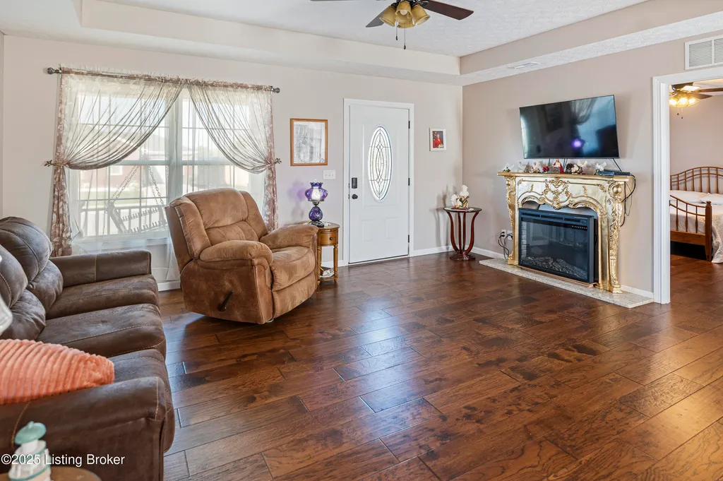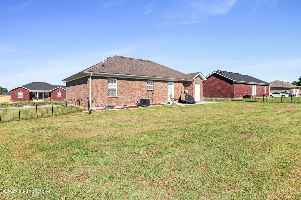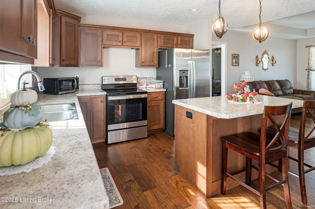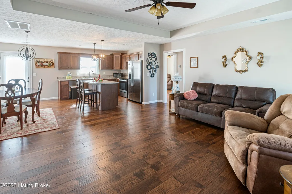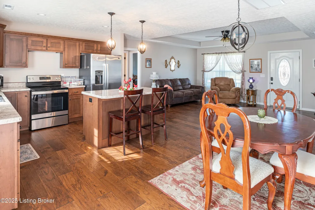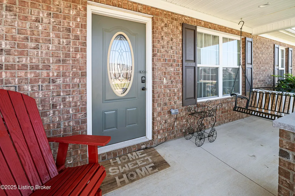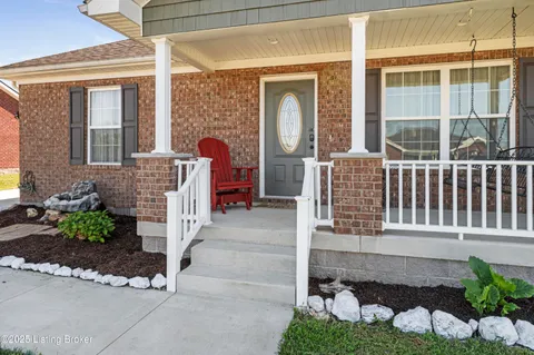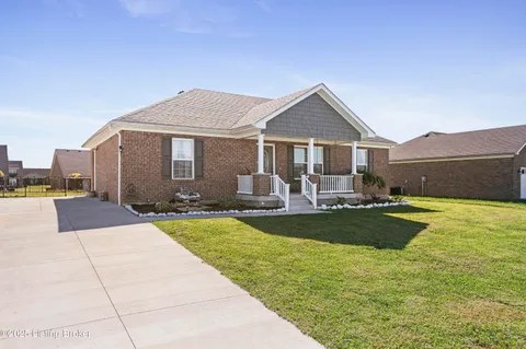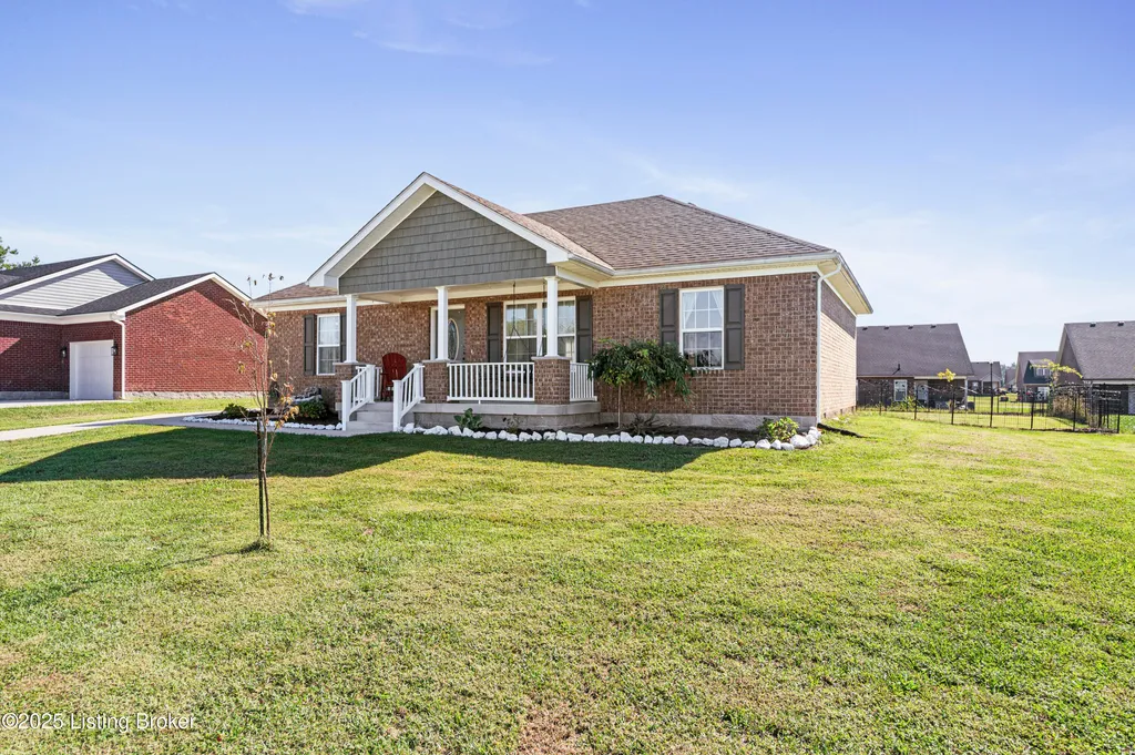 Located in Historic Bardstown, this nearly new ranch home offers modern comfort with small-town charm. Just two years old, it features 3 bedrooms and 2 baths with an open, airy floor plan. Gleaming hardwood floors and trey ceilings add character, while the spacious kitchen and dining area provide plenty of room for gatherings and daily living. The private primary suite offers a relaxing retreat with its own bath with walk-in shower and walk-in closet. Hypoallergenic filter system and new flex vents help keep the home fresh and healthy. Enjoy the covered front porch or unwind on the back patio and beautifully landscaped grounds. Built-in storage at the rear of the home adds convenience, making this move-in ready property both inviting and effortlessly stylish.