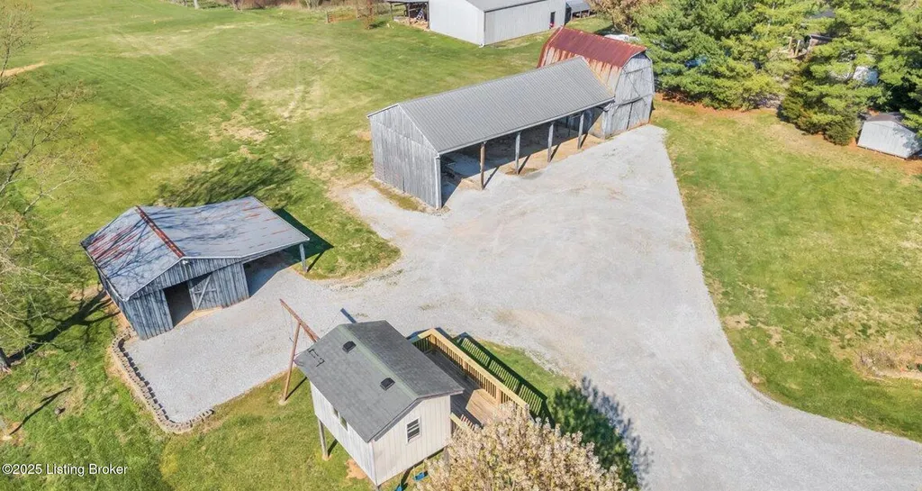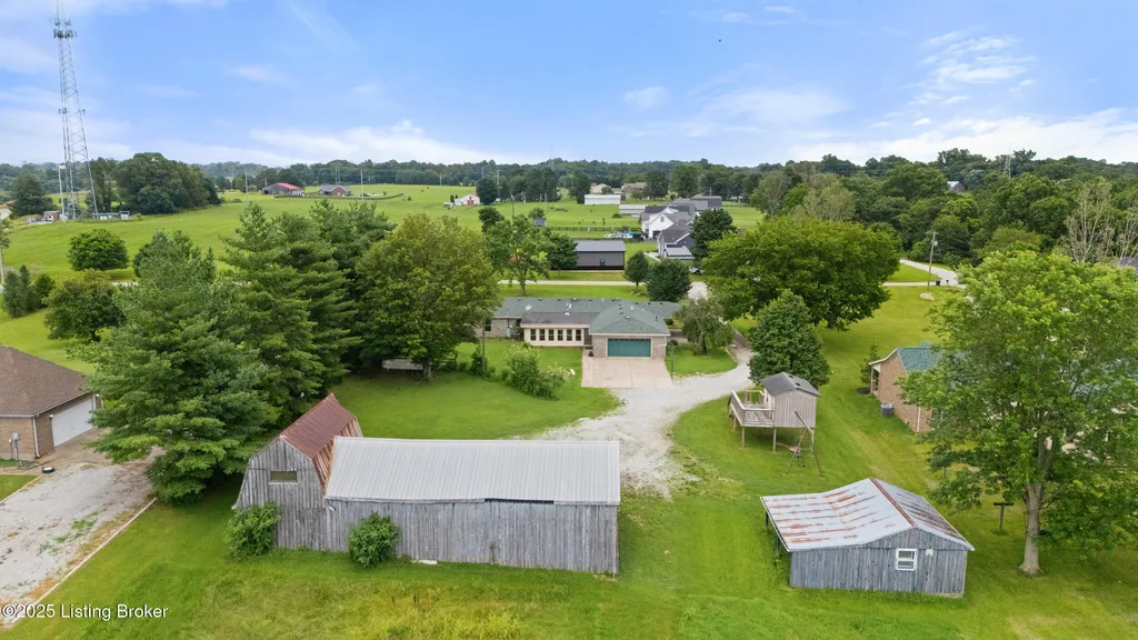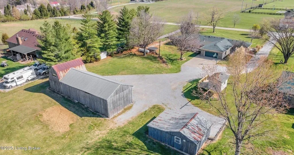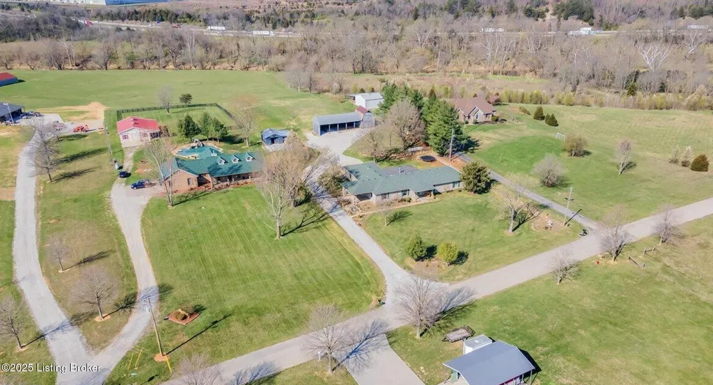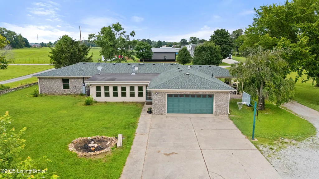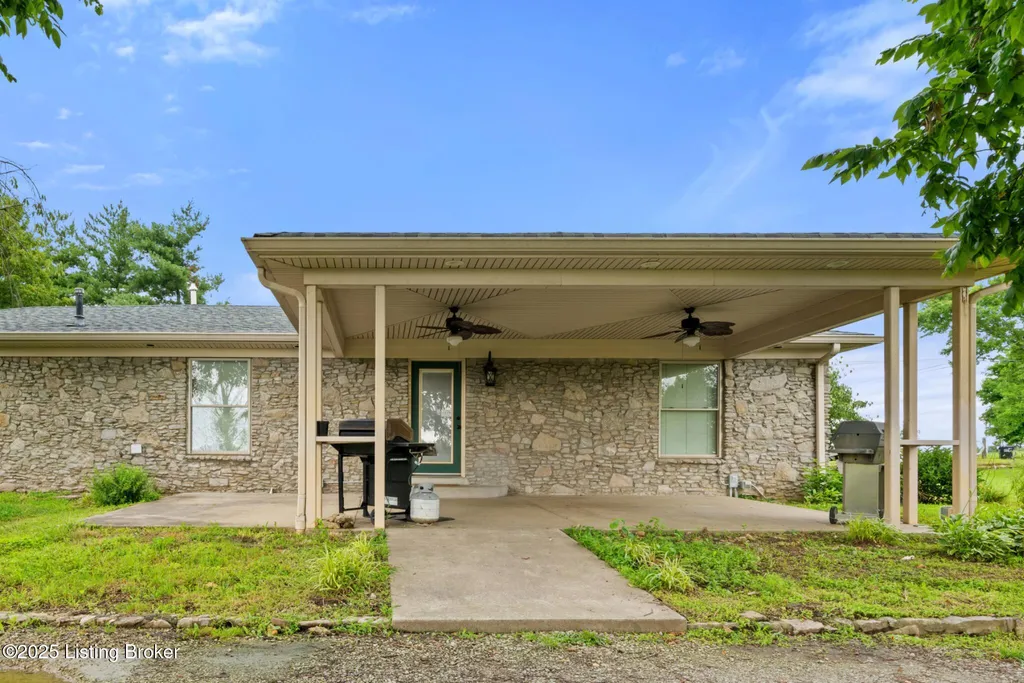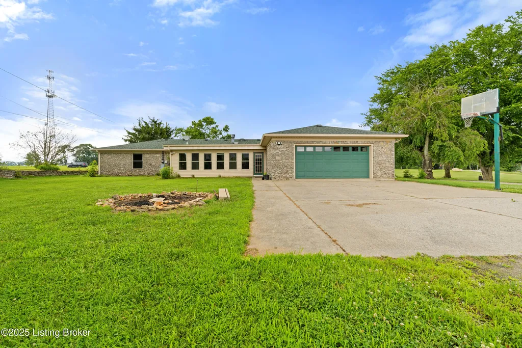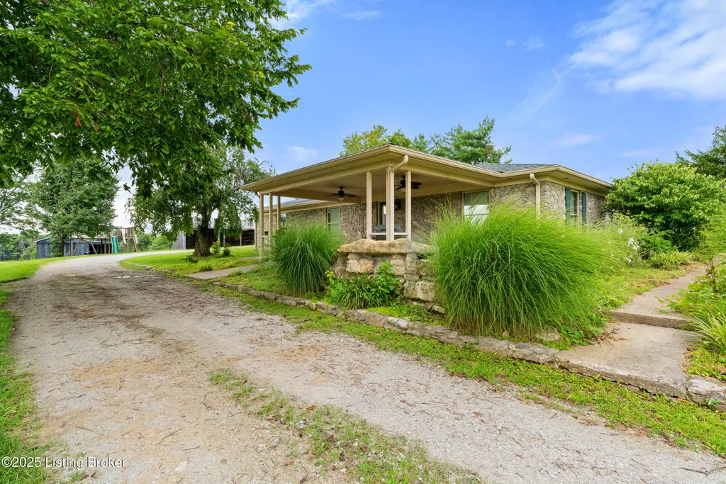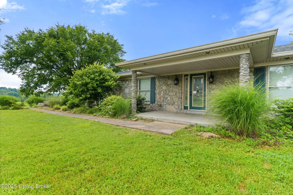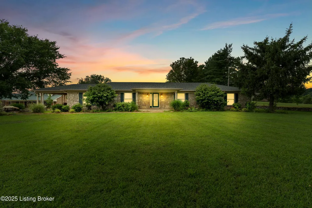 Welcome to Country Living at Its Best! Nestled on nearly 2 acres along Floyd's Fork, this beautiful creek stone ranch offers over 3,000 sq ft of living space. The heart of the home is the expansive kitchen with a large island, double pantries, and hardwood floors. A spacious great room with gas fireplace and skylight creates a warm, inviting atmosphere. Featuring 4 bedrooms and 4 full baths, including two primary suites with walk-in closets and en-suites, this home is ideal for comfort and flexibility. Enjoy the bright sunroom with peaceful views or relax outdoors on the covered porches overlooking a tranquil pond and waterfall. Additional highlights include a 2.5-car garage, 25x66 barn with electric, and 18x21 shed for extra storage or hobbies. Major updates HVAC and roof under 9 years old, newer water heaters (2023), Simonton windows, and double insulation provide peace of mind. BONUS: In addition to the main living space, the home includes a 200-square-foot, fully concrete below-grade storage cellar, conveniently accessible from inside the home. This durable and secure space houses the well water system, HVAC, and water heaters, while still offering ample room for additional storage. Schedule your private showing and discover this rare retreat today!