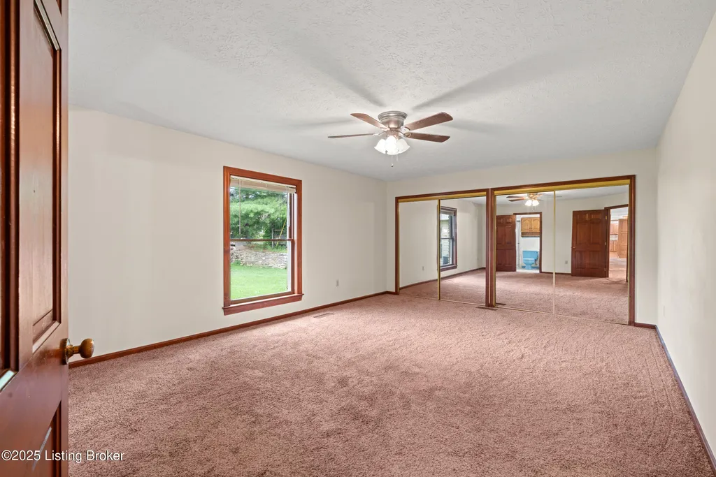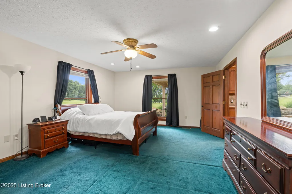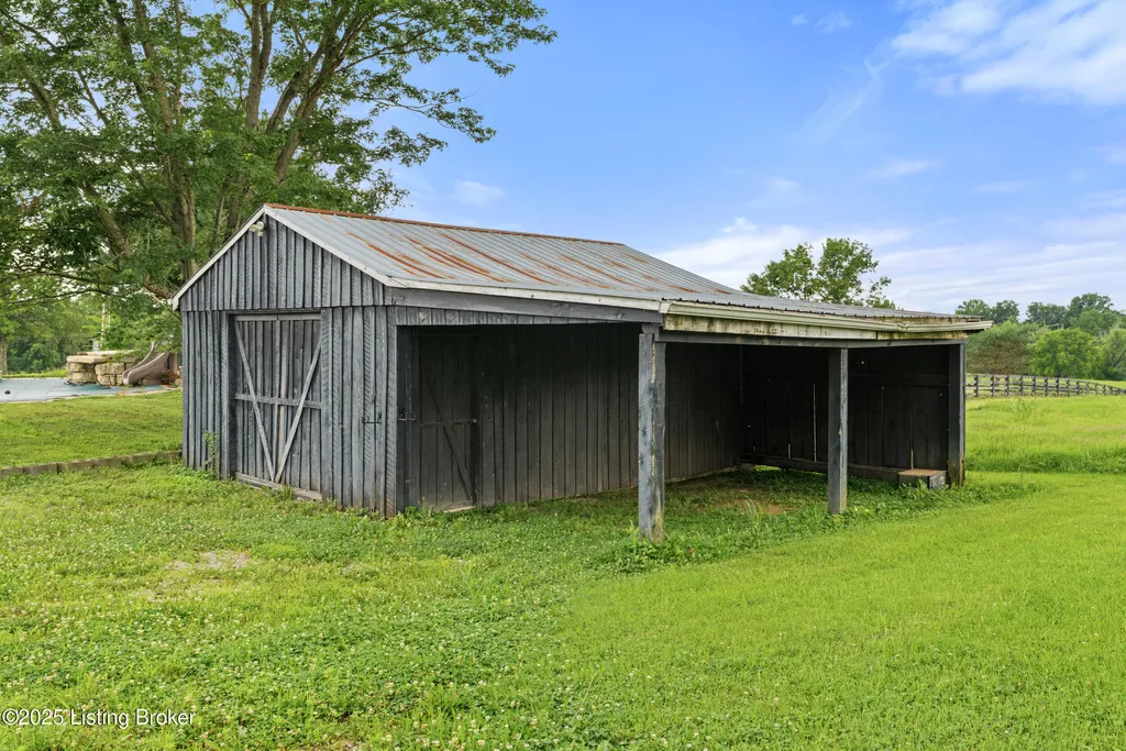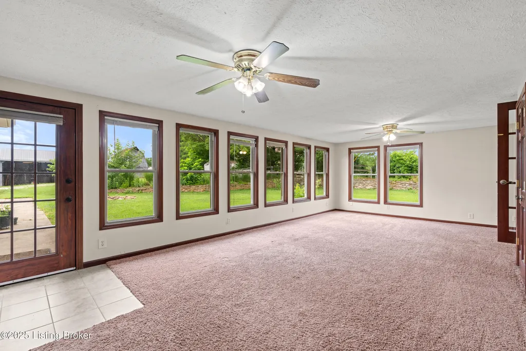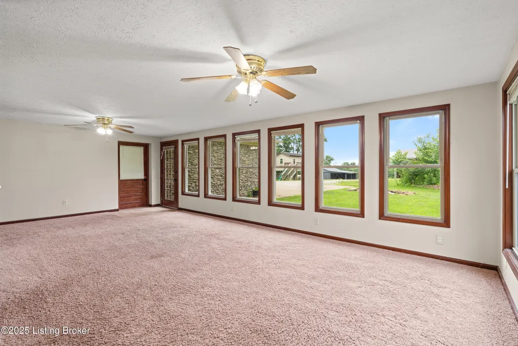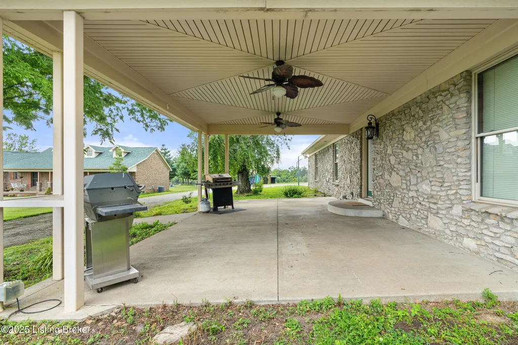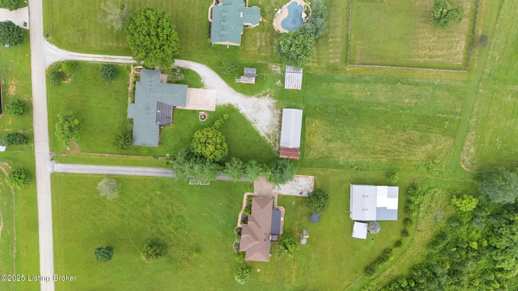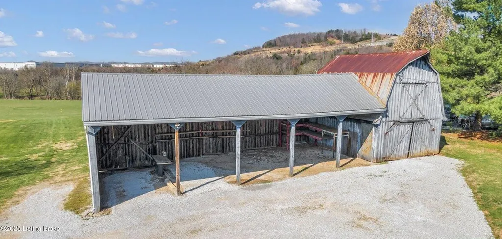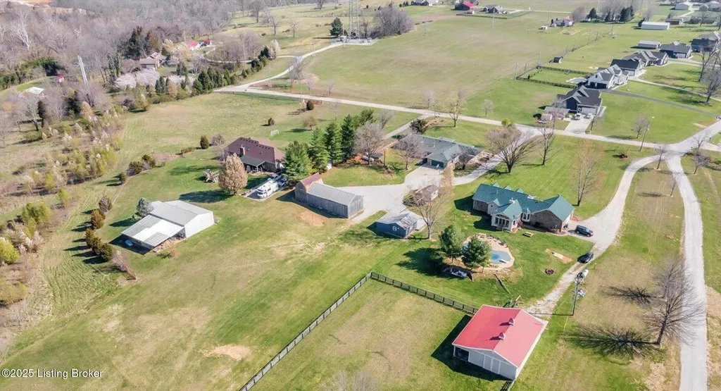 Welcome to Country Living at Its Best! Nestled on nearly 2 acres along Floyd's Fork, this beautiful creek stone ranch offers over 3,000 sq ft of living space. The heart of the home is the expansive kitchen with a large island, double pantries, and hardwood floors. A spacious great room with gas fireplace and skylight creates a warm, inviting atmosphere. Featuring 4 bedrooms and 4 full baths, including two primary suites with walk-in closets and en-suites, this home is ideal for comfort and flexibility. Enjoy the bright sunroom with peaceful views or relax outdoors on the covered porches overlooking a tranquil pond and waterfall. Additional highlights include a 2.5-car garage, 25x66 barn with electric, and 18x21 shed for extra storage or hobbies. Major updates HVAC and roof under 9 years old, newer water heaters (2023), Simonton windows, and double insulation provide peace of mind. BONUS: In addition to the main living space, the home includes a 200-square-foot, fully concrete below-grade storage cellar, conveniently accessible from inside the home. This durable and secure space houses the well water system, HVAC, and water heaters, while still offering ample room for additional storage. Schedule your private showing and discover this rare retreat today!