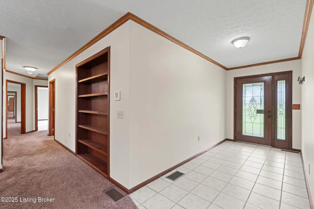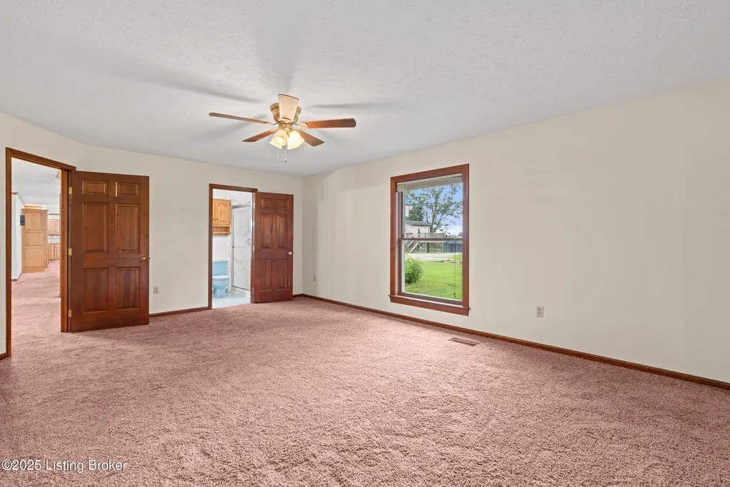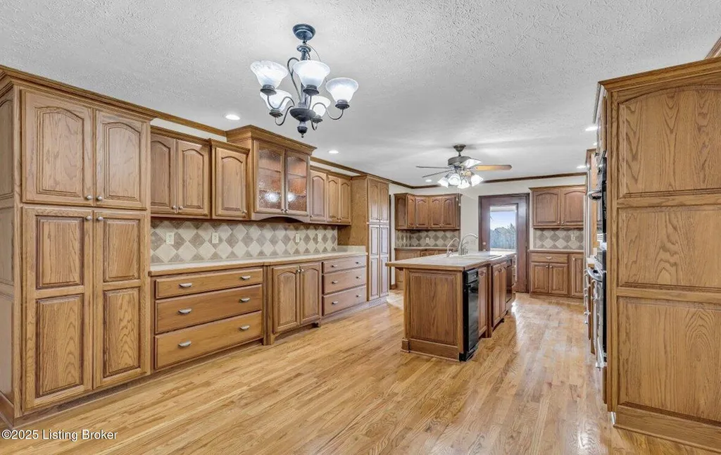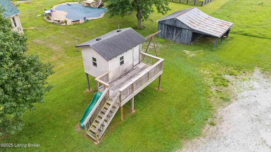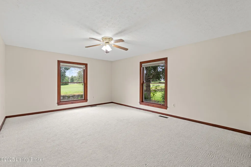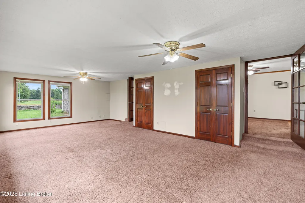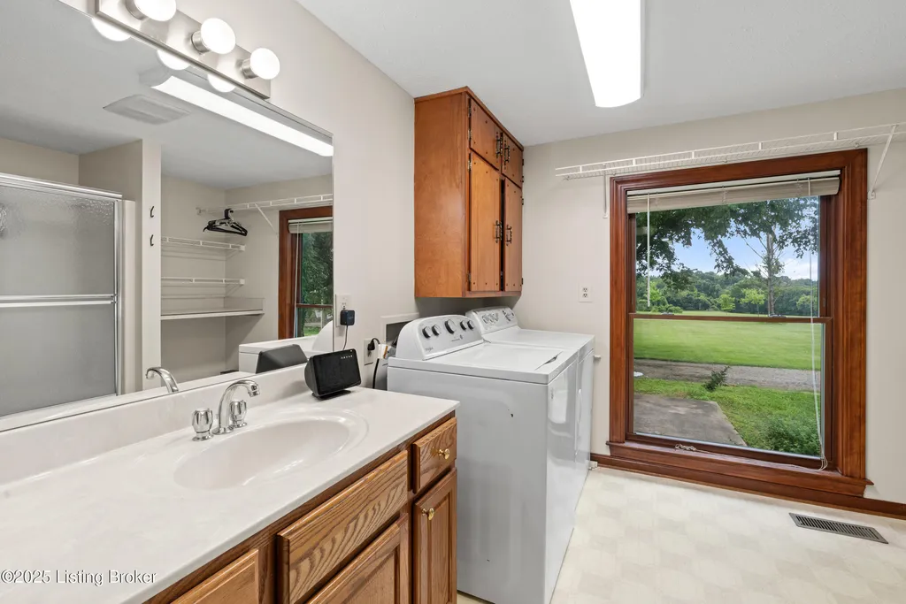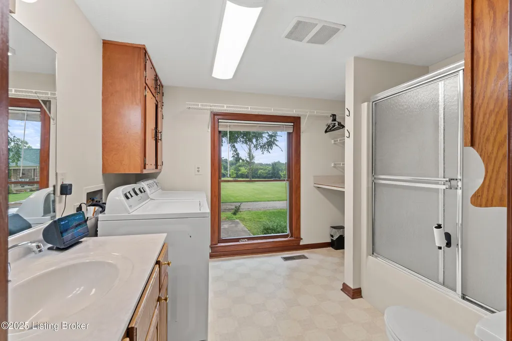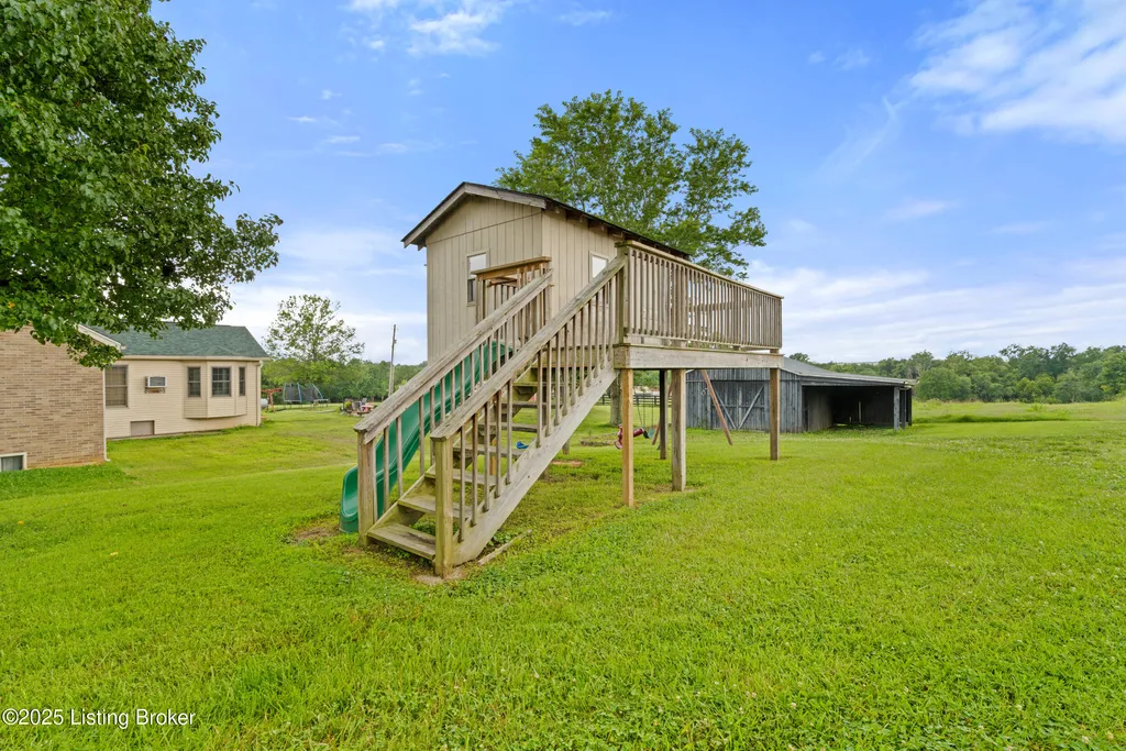 Welcome to Country Living at Its Best! Nestled on nearly 2 acres along Floyd's Fork, this beautiful creek stone ranch offers over 3,000 sq ft of living space. The heart of the home is the expansive kitchen with a large island, double pantries, and hardwood floors. A spacious great room with gas fireplace and skylight creates a warm, inviting atmosphere. Featuring 4 bedrooms and 4 full baths, including two primary suites with walk-in closets and en-suites, this home is ideal for comfort and flexibility. Enjoy the bright sunroom with peaceful views or relax outdoors on the covered porches overlooking a tranquil pond and waterfall. Additional highlights include a 2.5-car garage, 25x66 barn with electric, and 18x21 shed for extra storage or hobbies. Major updates HVAC and roof under 9 years old, newer water heaters (2023), Simonton windows, and double insulation provide peace of mind. BONUS: In addition to the main living space, the home includes a 200-square-foot, fully concrete below-grade storage cellar, conveniently accessible from inside the home. This durable and secure space houses the well water system, HVAC, and water heaters, while still offering ample room for additional storage. Schedule your private showing and discover this rare retreat today!