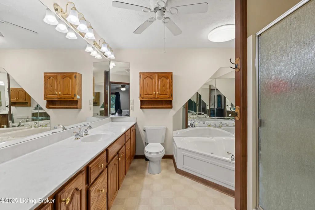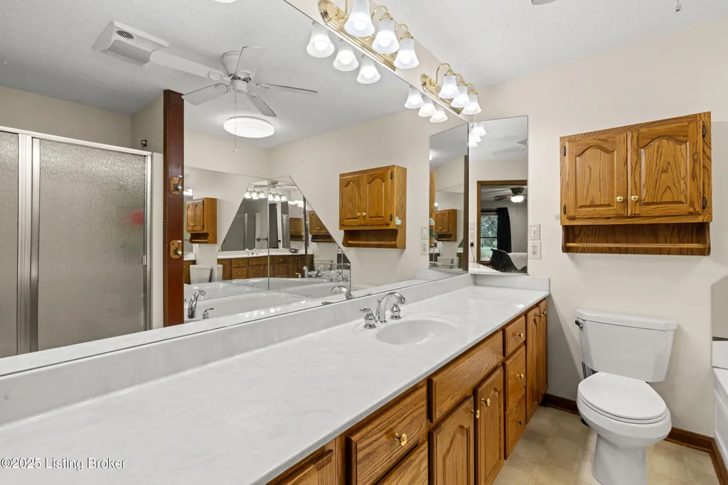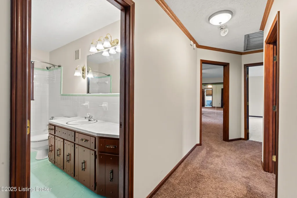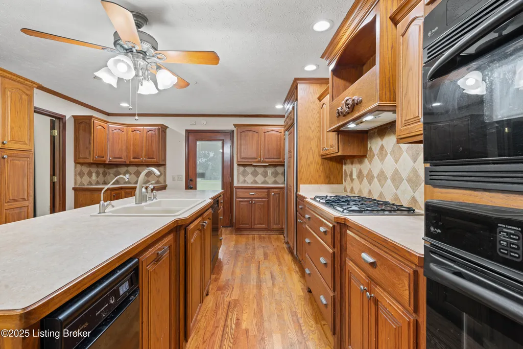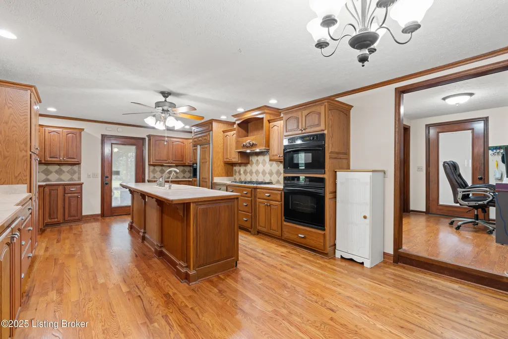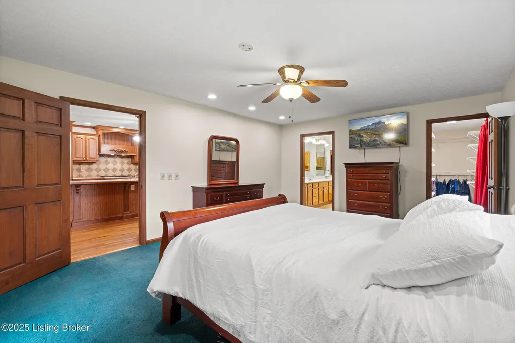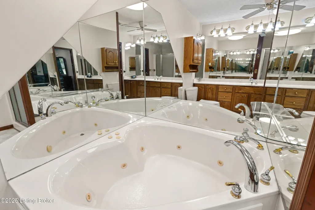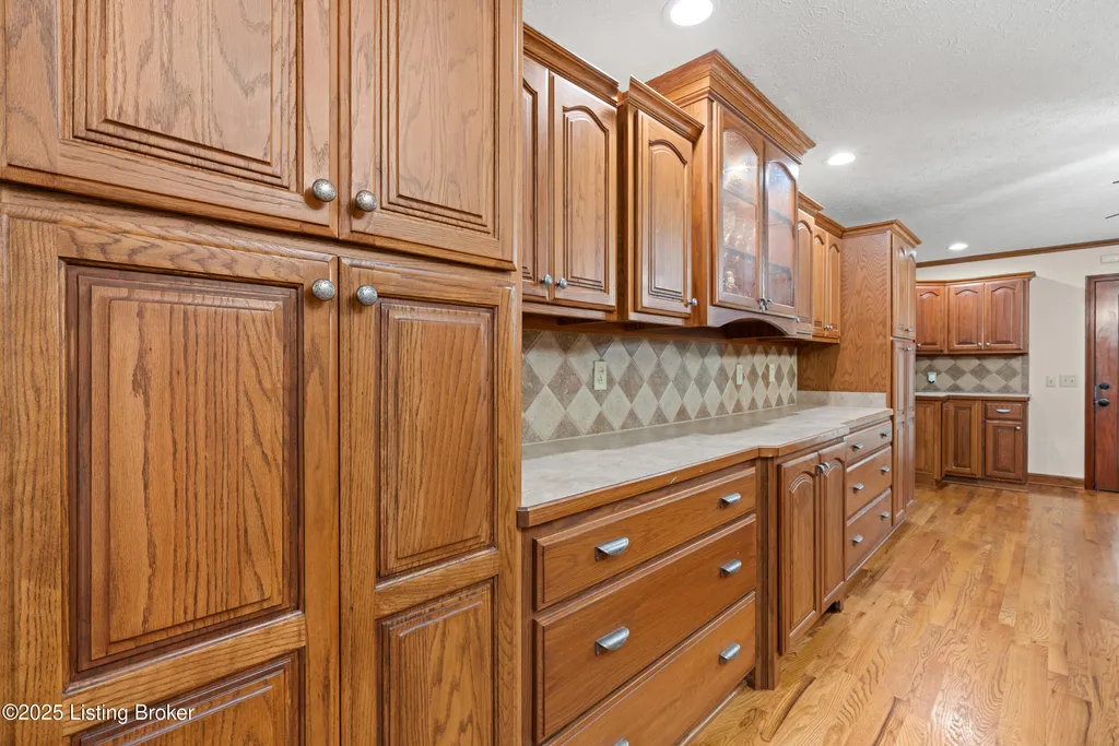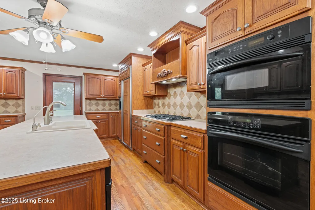 Welcome to Country Living at Its Best! Nestled on nearly 2 acres along Floyd's Fork, this beautiful creek stone ranch offers over 3,000 sq ft of living space. The heart of the home is the expansive kitchen with a large island, double pantries, and hardwood floors. A spacious great room with gas fireplace and skylight creates a warm, inviting atmosphere. Featuring 4 bedrooms and 4 full baths, including two primary suites with walk-in closets and en-suites, this home is ideal for comfort and flexibility. Enjoy the bright sunroom with peaceful views or relax outdoors on the covered porches overlooking a tranquil pond and waterfall. Additional highlights include a 2.5-car garage, 25x66 barn with electric, and 18x21 shed for extra storage or hobbies. Major updates HVAC and roof under 9 years old, newer water heaters (2023), Simonton windows, and double insulation provide peace of mind. BONUS: In addition to the main living space, the home includes a 200-square-foot, fully concrete below-grade storage cellar, conveniently accessible from inside the home. This durable and secure space houses the well water system, HVAC, and water heaters, while still offering ample room for additional storage. Schedule your private showing and discover this rare retreat today!
